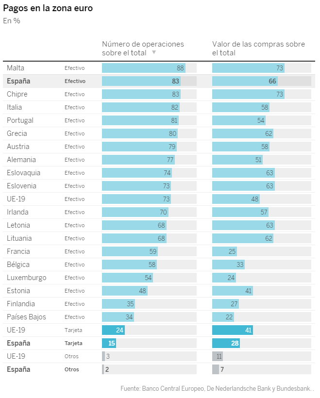 Los cálculos del banco central indican que movieron el 66% del valor de las operaciones, en billetes de euro, frente al 48% que hicieron los europeos de media. La encuesta oficial dice que en 2019 el 83% de las operaciones minoristas en el punto de venta (comercios) y entre personas en España se hicieron con billetes, frente al 73% de media en la zona euro el año pasado. El uso de la tarjeta fue del 15% de las pequeñas transacciones españolas frente al 24% de Europa.
